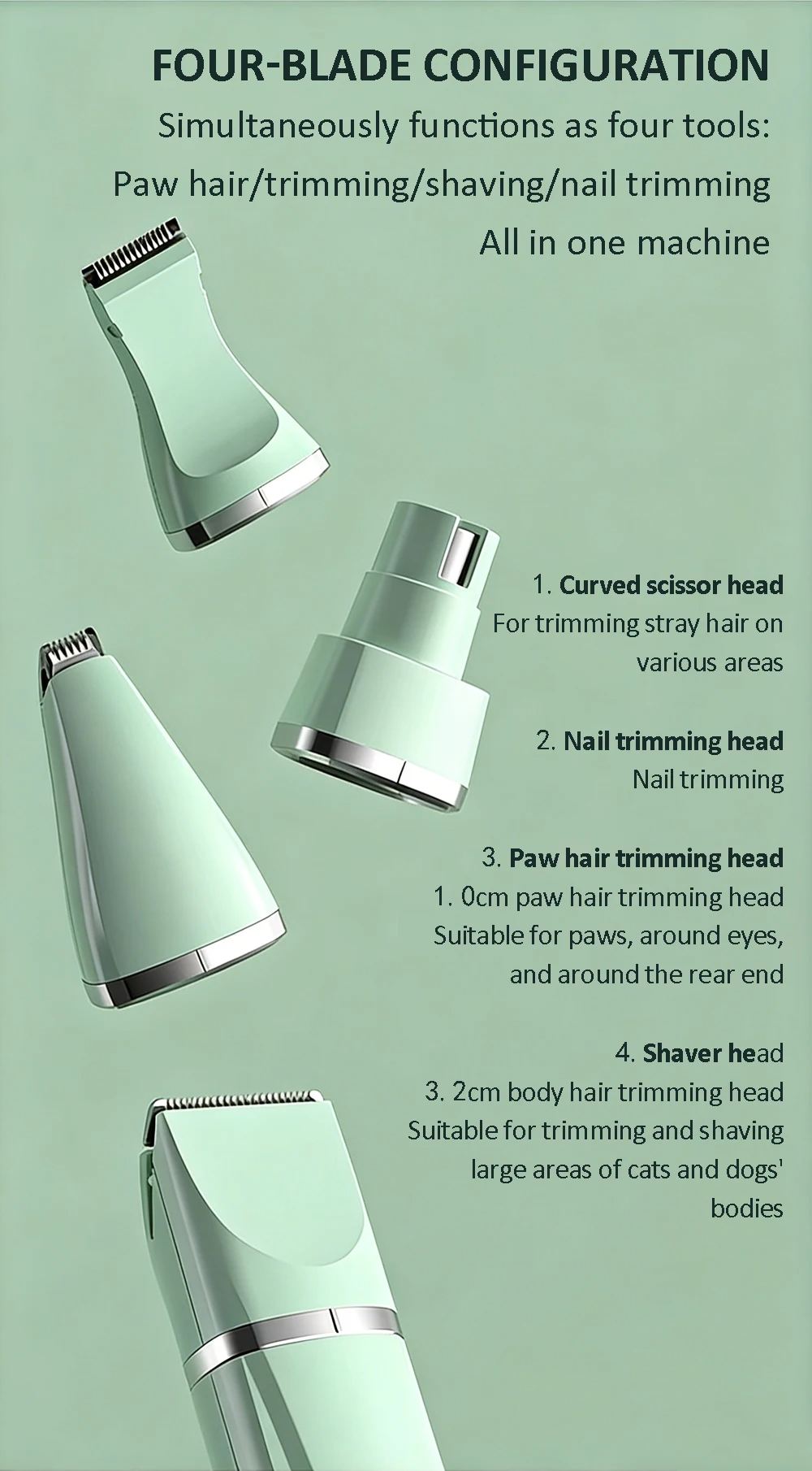 4. Four Types of Blade Heads: Curved scissor head, nail trimmer head, paw hair trimmer head, and shaving head